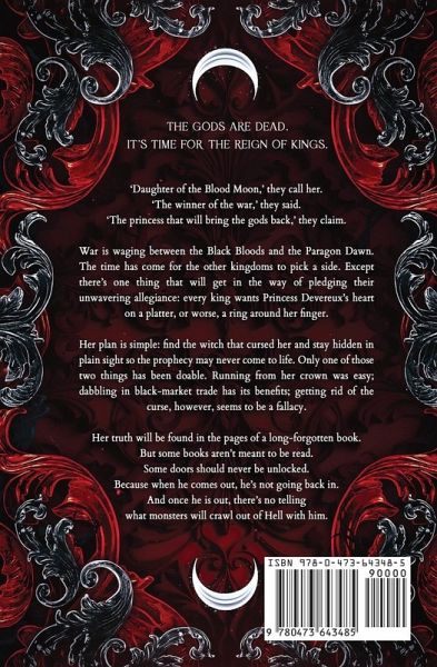 'Daughter of the Blood Moon,' they call her. 'The winner of the war,' they said. 'The princess that will bring the gods back,' they claim. War is waging between the Black Bloods and the Paragon Dawn. The time has come for the other kingdoms to pick a side. Except there's one thing that will get in the way of pledging their unwavering allegiance: every king wants Princess Devereux's heart on a platter, or worse, a ring around her finger. Her plan is simple: find the witch that cursed her and stay hidden in plain sight so the prophecy may never come to life. Only one of those two things has been doable. Running from her crown was easy; dabbling in black-market trade has its benefits; getting rid of the curse, however, seems to be a fallacy. Her truth will be found in the pages of a long-forgotten book. But some books aren't meant to be read. Some doors should never be unlocked. Because when he comes out, he's not going back in. And once he is out, there's no telling what monsters will crawl out of Hell with him.
