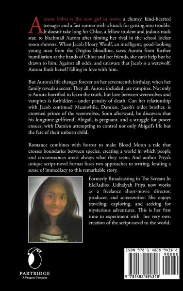 Aurora Volvo is the new girl in town: a clumsy, kind-hearted teenager and a fast runner with a knack for getting into trouble. It doesn't take long for Chloe, a fellow student and jealous track star, to blackmail Aurora after filming her rival in the school locker room showers. When Jacob Hoary Woulf, an intelligent, good-looking young man from the Origins bloodline, saves Aurora from further humiliation at the hands of Chloe and her friends, she can't help but be drawn to him. Against all odds, and unaware that Jacob is a werewolf, Aurora finds herself falling in love with him. But Aurora's life changes forever on her seventeenth birthday, when her family reveals a secret: They all, Aurora included, are vampires. Not only is Aurora horrified to learn the truth, but love between werewolves and vampires is forbidden-under penalty of death. Can her relationship with Jacob continue? Meanwhile, Damien, Jacob's older brother, is crowned prince of the werewolves. Soon afterward, he discovers that his longtime girlfriend, Abigail, is pregnant, and a struggle for power ensues, with Damien attempting to control not only Abigail's life but the fate of their unborn child. Romance combines with horror to make Blood Moon a tale that crosses boundaries between species, creating a world in which people and circumstances aren't always what they seem. And author Priya's unique script-novel format fuses two approaches to writing, lending a sense of immediacy to this remarkable story.