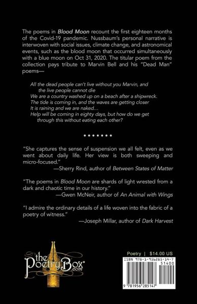 The poems in Blood Moon recount the first eighteen months of the Covid-19 pandemic. Elaine Nussbaum's personal narrative is interwoven with social issues, climate change, and astronomical events, such as the blood moon that occurred simultaneously with a blue moon on Oct 31, 2020. The titular poem from the collection pays tribute to Marvin Bell and his "Dead Man" poems- All the dead people can't live without you Marvin, and the live people cannot die We are a country washed up on a beach after a shipwreck. The tide is coming in, and the waves are getting closer It is raining and we are naked... Help will be coming in eighty days, but how do we get through this without eating each other? ______________ "She captures the sense of suspension we all felt, even as we went about daily life. Her view is both sweeping and micro-focused."-Sherry Rind, author of Between States of Matter "The poems in Blood Moon are shards of light wrested from a dark and chaotic time in our history."-Gwen McNeir, author of An Animal with Wings "I admire the ordinary details of a life woven into the fabric of a poetry of witness."-Joseph Millar, author of Dark Harvest