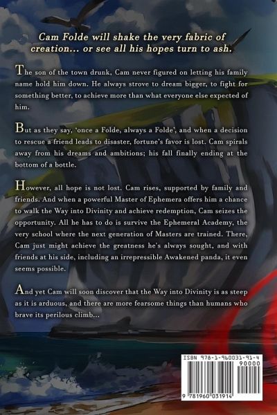 Cam Folde will shake the very fabric of creation... or see all his hopes turn to ash. The son of the town drunk, Cam never figured on letting his family name hold him down. He always strove to dream bigger, to fight for something better, to achieve more than what everyone else expected of him. But, as they say, 'once a Folde, always a Folde', and when a decision to rescue a friend leads to disaster, fortune's favor is lost. Cam spirals away from his dreams and ambitions; his fall finally ending at the bottom of a bottle. But all hope is not lost. Cam rises, supported by family and friends. And when a powerful Master of Ephemera offers him a chance to walk the Way into Divinity and achieve redemption, Cam seizes the opportunity. All he has to do is survive the Ephemeral Academy, the very school where the next generation of Masters are trained. There, Cam just might achieve the greatness he's always sought, and with friends at his side, including an irrepressible Awakened panda, it even seems possible. But Cam will soon discover that the Way into Divinity is as steep as it is arduous, and there are more fearsome things than humans who brave its perilous climb...