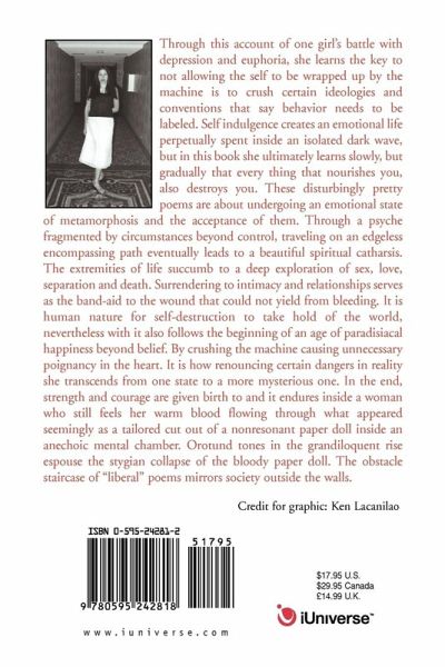 Through this account of one girl's battle with depression and euphoria, she learns the key to not allowing the self to be wrapped up by the machine is to crush certain ideologies and conventions that say behavior needs to be labeled. Self indulgence creates an emotional life perpetually spent inside an isolated dark wave, but in this book she ultimately learns slowly, but gradually that every thing which nourishes you, destroys you simultaneously. These disturbingly pretty poems are about undergoing an emotional state of metamorphosis and the acceptance of them. Through a mind fragmented by circumstances beyond control, traveling on an edgeless encompassing path eventually leads to a beautiful spiritual catharsis. The extremities of life succumb to a deep exploration of sex, love, separation and death. Surrendering to intimacy and relationships serves as the band-aid to the wound that could not yield from bleeding. It is human nature for self-destruction to take hold of the world, nevertheless with it also follows the beginning of an age of paradisiacal happiness beyond belief. By crushing the machine causing unnecessary poignancy in the heart. It is how renouncing certain dangers in reality transcend from one state to a more mysterious one. In the end, strength and courage is given birth to and endures inside a woman who still feels her warm blood flowing through what appeared seemingly to be a tailored cut out of a non-resonant paper doll.
