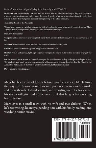 Blood of the Ancients: 5 Spine-Chilling Short Stories by MARK TAYLOR Hush now, and listen closely. Can you hear it? A faint whisper, like dust settling on forgotten memories, a tremor in the darkness that chills you to the bone. It speaks of a time before time, of entities older than written history, their hunger an insatiable ache gnawing at the fabric of reality. This is the Blood of the Ancients. Within these pages, five chilling tales await, each a brushstroke upon a canvas of primeval horror. Mark Taylor, a weaver of nightmares, invites you on a descent into the abyss. Here, you'll encounter: Vampires unlike any you've ever imagined, their thirst not merely for blood, but for the very essence of life. Shadows that writhe and twist, harboring secrets older than humanity itself. Rituals whispered in the wind, promising power at a terrible cost. Hunters, weary and scarred, fighting a desperate war against a tide of darkness that threatens to engulf the world. But be warned, dear reader. As you delve deeper, the lines between reality and nightmare begin to blur. The shadows may reach out and caress you, the whispers may twist your thoughts. For the Blood of the Ancients is potent, and it thirsts not just for your blood, but for your very soul. Do you dare to turn the page?