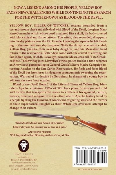 Now a legend among his people, Yellow Boy faces new challenges while continuing the search for the witch known as Blood of the Devil. Yellow Boy, Killer of Witches, returns wounded from a cat-and-mouse chase and rifle duel with Blood of the Devil, the giant Mexican/Comanche witch whose head is painted like a skull, his body covered with black spiral and flame tattoos. The witch, also wounded, disappears into the dry plains across the Rio Grande, knowing the Apache he left bleeding in the sand will one day reappear. With the Army occupation ended, Yellow Boy, Juanita, their new baby daughter, and his Mescalero band return to the reservation. Better days come with the arrival of a strong but fair Indian agent, W.H.H. Llewellyn, who the Mescaleros call "Tata Crooked Nose." Yellow Boy joins Llewellyn's tribal police and for a time becomes an Army scout participating in General Crook's Sierra Madre Campaign returning Apaches to the San Carlos Reservation. He finds and faces Blood of the Devil but later loses his daughter to pneumonia sweeping the reservation. Warned of his destiny by Geronimo, he dreams of a young boy he will one day save from murder. Blood of the Devil, Book 2 of the Life and Times of Yellow Boy, Mescalero Apache, continues Killer of Witches's powerful story-truth told with fiction that transports the reader to a different background, culture, history, time, and religion. It is the other side of Apache history lived by a people fighting the tsunami of Americans migrating west and the terrors of their supernatural insights as their White Eye overseers attempt to change their culture.