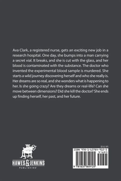 Ava Clark, a registered nurse, gets an exciting new job in a research hospital. One day, she bumps into a man carrying a secret vial. It breaks, and she is cut with the glass, and her blood is contaminated with the substance. The doctor who invented the experimental blood sample is murdered. She starts a wild journey discovering herself and who she really is. Her dreams are so real, and she wonders what is happening to her. Is she going crazy? Are they dreams or real-life? Can she move between dimensions? Did she kill the doctor? She ends up finding herself, her past, and her future.