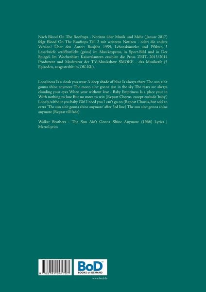 Nach Blood On The Rooftops - Notizen über Musik und Mehr (Januar 2017) folgt Blood On The Rooftops Teil 2 mit weiteren Notizen - oder: die andere Version! Über den Autor: Baujahr 1959, Lebenskünstler und Pfälzer, 3 Leserbriefe veröffentlicht (grins) im Musikexpress, in Sport-Bild und in Der Spiegel. Im Wochenblatt Kaiserslautern erschien die Prosa ZEIT. 2013/2014 Produzent und Moderator der TV-Musikshow SMOKE - das Musikcafe (5 Episoden, ausgestrahlt im OK-KL).Loneliness Is a cloak you wear A deep shade of blue Is always there The sun ain't gonna shine anymore The moon ain't gonna rise in the sky The tears are always clouding your eyes When your without love - Baby Emptiness Is a place your in With nothing to lose But no more to win (Repeat Chorus, except exclude 'baby') Lonely, without you baby Girl I need you I can't go on (Repeat Chorus, but add an extra 'The sun ain't gonna shine anymore' after 3rd line) The sun ain't gonna shine anymore (Repeat till fade)Walker Brothers - The Sun Ain't Gonna Shine Anymore (1966) Lyrics MetroLyrics