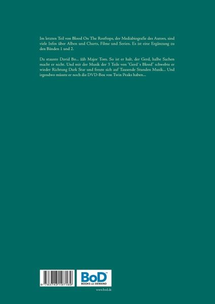 Im letzten Teil von Blood On The Rooftops, der Mediabiografie des Autors, sind viele Infos über Alben und Charts, Filme und Serien. Es ist eine Ergänzung zu den Bänden 1 und 2. Da staunte David Bo ... ääh Major Tom. So ist er halt, der Gerd, halbe Sachen macht er nicht. Und mit der Musik der 3 Teile von "Gerd´s Blood" schwebte er wieder Richtung Dark Star und freute sich auf Tausende Stunden Musik ... Und irgendwo müsste er noch die DVD-Box von Twin Peaks haben ...