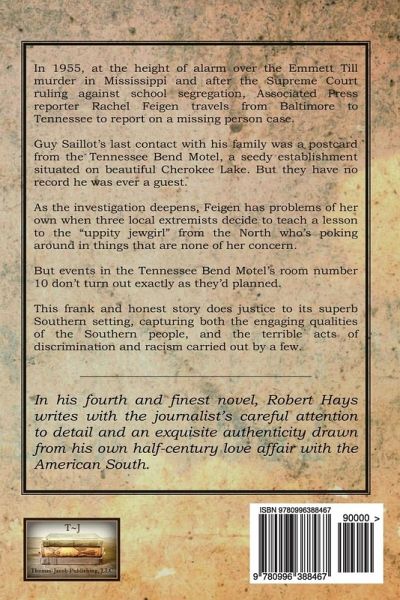 In 1955, at the height of alarm over the Emmett Till murder in Mississippi and after the Supreme Court ruling against school segregation, Associated Press reporter Rachel Feigen travels from Baltimore to Tennessee to report on a missing person case. Guy Saillot's last contact with his family was a postcard from the Tennessee Bend Motel, a seedy establishment situated on beautiful Cherokee Lake. But they have no record he was ever a guest. As the investigation deepens, Feigen has problems of her own when three local extremists decide to teach a lesson to the "uppity jewgirl" from the North who's poking around in things that are none of her concern. But events in the Tennessee Bend Motel's room number 10 don't turn out exactly as they'd planned. This frank and honest story does justice to its superb Southern setting, capturing both the engaging qualities of the Southern people, and the terrible acts of discrimination and racism carried out by a few.
