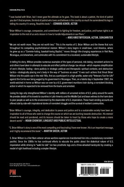 "We are not worth more, they are not worth less." This is the mantra of S. Brian Willson and the theme that runs throughout his compelling psycho-historical memoir. Willson’s story begins in small-town, rural America, where he grew up as a "Commie-hating, baseball-loving Baptist," moves through life-changing experiences in Viet Nam, Nicaragua and elsewhere, and culminates with his commitment to a localized, sustainable lifestyle. In telling his story, Willson provides numerous examples of the types of personal, risk-taking, nonviolent actions he and others have taken in attempts to educate and effect political change: tax refusal—which requires simplification of one’s lifestyle; fasting—done publicly in strategic political and/or therapeutic spiritual contexts; and obstruction tactics—strategically placing one’s body in the way of "business as usual." It was such actions that thrust Brian Willson into the public eye in the mid-’80s, first as a participant in a high-profile, water-only "Veterans Fast for Life" against the Contra war being waged by his government in Nicaragua. Then, on a fateful day in September 1987, the world watched in horror as Willson was run over by a U.S. government munitions train during a nonviolent blocking action in which he expected to be removed from the tracks and arrested. Losing his legs only strengthened Willson’s identity with millions of unnamed victims of U.S. policy around the world. He provides details of his travels to countries in Latin America and the Middle East and bears witness to the harm done to poor people as well as to the environment by the steamroller of U.S. imperialism. These heart-rending accounts are offered side by side with inspirational stories of nonviolent struggle and the survival of resilient communities Willson’s expanding consciousness also uncovers injustices within his own country, including insights gained through his study and service within the U.S. criminal justice system and personal experiences addressing racial injustices. He discusses coming to terms with his identity as a Viet Nam veteran and the subsequent service he provides to others as director of a veterans outreach center in New England. He draws much inspiration from friends he encounters along the way as he finds himself continually drawn to the path leading to a simpler life that seeks to "do no harm.&rdquo Throughout his personal journey Willson struggles with the question, "Why was it so easy for me, a ’good’ man, to follow orders to travel 9,000 miles from home to participate in killing people who clearly were not a threat to me or any of my fellow citizens?" He eventually comes to the realization that the "American Way of Life" is AWOL from humanity, and that the only way to recover our humanity is by changing our consciousness, one individual at a time, while striving for collective cultural changes toward "less and local." Thus, Willson offers up his personal story as a metaphorical map for anyone who feels the need to be liberated from the American Way of Life—a guidebook for anyone called by conscience to question continued obedience to vertical power structures while longing to reconnect with the human archetypes of cooperation, equity, mutual respect and empathy.