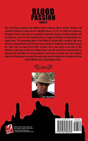 This Forth Novel continues the Modern Gothic American Horror conflict; between the untainted Passions of Good and the unbridled Horrors of Evil, for which the ingenuous, through no fault of their own are compelled to deal with, because of being endowed with the tenacious, curse of a life-sustaining need, to ingest fresh blood of living beings, on a regular basis. This astonishing Novel is the telling of, Rachael Valli's coming of age story, into now a young woman and of how she must continue to handle her extraordinary way of life, away from the town of her birth, in which, she is now living as the alias of, Mia Harkness, continuing to write her Vampyre Novel, and still having the ravenous desire to consume the fresh Blood of a living organism, must ensue to sustain her, very eccentric dilemma of having been conceived from what was once the tainted Love, between a Normal Human Mother and a Living Vampire Father.