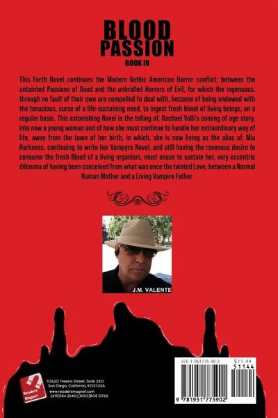 This Forth Novel continues the Modern Gothic American Horror conflict; between the untainted Passions of Good and the unbridled Horrors of Evil, for which the ingenuous, through no fault of their own are compelled to deal with, because of being endowed with the tenacious, curse of a life-sustaining need, to ingest fresh blood of living beings, on a regular basis. This astonishing Novel is the telling of, Rachael Valli's coming of age story, into now a young woman and of how she must continue to handle her extraordinary way of life, away from the town of her birth, in which, she is now living as the alias of, Mia Harkness, continuing to write her Vampyre Novel, and still having the ravenous desire to consume the fresh Blood of a living organism, must ensue to sustain her, very eccentric dilemma of having been conceived from what was once the tainted Love, between a Normal Human Mother and a Living Vampire Father.