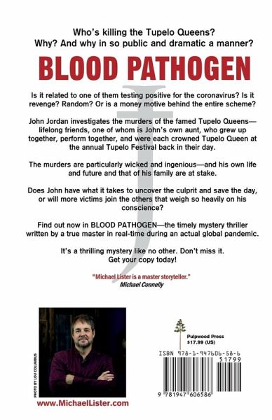 Who's killing the Tupelo Queens? Why? And why in so public and dramatic a manner? Is it related to one of them testing positive for the coronavirus? Is it revenge? Random? Or is a money motive behind the entire scheme? John Jordan investigates the murders of the famed Tupelo Queens-lifelong friends, one of whom is John's own aunt, who grew up together, perform together, and were each crowned Tupelo Queen at the annual Tupelo Festival back in their day. The murders are particularly wicked and ingenious-and his own life and future and that of his family are at stake. Does John have what it takes to uncover the culprit and save the day, or will more victims join the others that weigh so heavily on his conscience? Find out now in BLOOD PATHOGEN-the timely mystery thriller written by a true master in real-time during an actual global pandemic. It's a thrilling mystery like no other. Don't miss it. Get your copy today! "Michael Lister is a master storyteller." Michael Connelly
