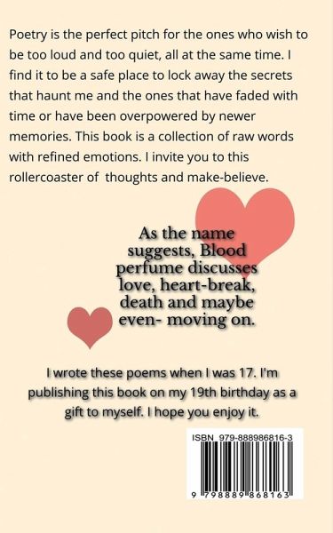Poetry is the perfect pitch for the ones who wish to be too loud and too quiet, all at the same time. I find it to be a safe place to lock away the secrets that haunt me and the ones that have faded with time or have been overpowered by newer memories. This book is a collection of raw words with refined emotions. I invite you to this rollercoaster of thoughts and make-believe. As the name suggests, Blood perfume discusses love, heart-break, death and maybe even- moving on.