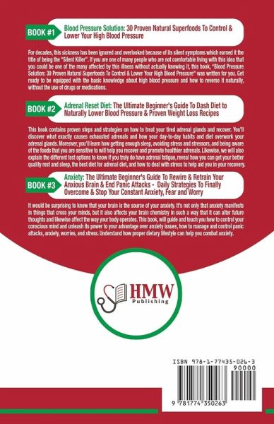 3 BOOKS IN 1: BOOK #1 > Blood Pressure Solution: 30 Proven Natural Superfoods To Control & Lower Your High Blood Pressure For decades, this sickness has been ignored and overlooked because of its silent symptoms which earned it the title of being the "Silent Killer". If you are one of many people who are not comfortable living with this idea that you could be one of the many affected by this illness without actually knowing it, this book, "Blood Pressure Solution: 30 Proven Natural Superfoods To Control & Lower Your High Blood Pressure" was written for you. Get ready to be equipped with the basic knowledge about high blood pressure and how to reverse it naturally, without the use of drugs or medications. BOOK #2 > Adrenal Reset Diet: The Ultimate Beginner's Guide To Adrenal Fatigue Reset Diet - Naturally Reset Hormones, Reduce Stress & Anxiety and Boost Your Energy Levels This book contains proven steps and strategies on how to treat your tired adrenal glands and recover. You’ll discover what exactly causes exhausted adrenals and how your day-to-day habits and diet overwork your adrenal glands. Moreover, you’ll learn how getting enough sleep, avoiding stress and stressors, and being aware of the foods that you are sensitive to will help you recover and promote healthier adrenals. Likewise, we will also explain the different test options to know if you truly do have adrenal fatigue, reveal how you can get your better quality rest and sleep, the best diet for adrenal diet, and how to deal with stress to help aid you in your recovery. BOOK #3 > Anxiety: The Ultimate Beginner's Guide To Rewire & Retrain Your Anxious Brain & End Panic Attacks - Daily Strategies To Finally Overcome & Stop Your Constant Anxiety, Fear and Worry It would be surprising to know that your brain is the source of your anxiety. It’s not only that anxiety manifests in things that cross your minds, but it also affects your brain chemistry in such a way that it can alter future thoughts and likewise affect the way your body operates. This book will guide will teach you how to control your conscious mind and unleash its power to your advantage over anxiety issues, how to manage and control panic attacks, anxiety, worries, and stress. Understand how proper dietary lifestyle can help you combat anxiety.