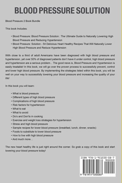 Blood Pressure 2 Book Bundle This book Includes: Blood Pressure: Blood Pressure Solution: The Ultimate Guide to Naturally Lowering High Blood Pressure and Reducing Hypertension Blood Pressure: Solution - 54 Delicious Heart Healthy Recipes That Will Naturally Lower High Blood Pressure and Reduce Hypertension With close to a third of adult Americans have been diagnosed with high blood pressure and hypertension, yet over 50% of diagnosed patients don’t have it under control, high blood pressure and hypertension are a serious problem... The good news is, Blood Pressure and Hypertension is easily treatable! In this book, we will go over the proven process to successfully prevent, control and lower high blood pressure. By implementing the strategies listed within this book, you will be well on your way to successfully lowering your blood pressure and increasing the quality of your life! In this book you will learn: What is blood pressure Different types of high blood pressure Complications of high blood pressure Risk factors for hypertension What to eat What to avoid Do’s and Don’ts in cooking Exercise and weight loss strategies for hypertension Stress and high blood pressure Sample recipes for lower blood pressure (breakfast, lunch, dinner, snacks) Foods to substitute to lower blood pressure How to live with high blood pressure And much more… The new heart-healthy life is just right around the corner. So grab a copy of this book and start lowering your blood pressure today!