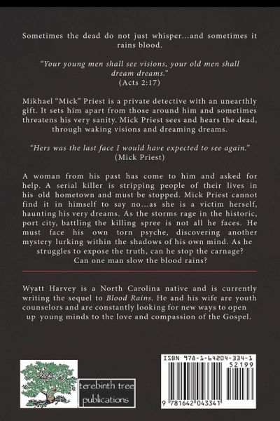 Sometimes the dead do not just whisper…and sometimes it rains blood. "Your young men shall see visions, your old men shall dream dreams." (Acts 2:17) Mikhael "Mick" Priest is a private detective with an unearthly gift. It sets him apart from those around him and sometimes threatens his very sanity. Mick Priest sees and hears the dead, through waking visions and dreaming dreams. "Hers was the last face I would have expected to see again." (Mick Priest) A woman from his past has come to him and asked for help. A serial killer is stripping people of their lives in his old hometown and must be stopped. Mick Priest cannot find it in himself to say no…as she is a victim herself, haunting his very dreams. As the storms rage in the historic, port city, battling the killing spree is not all he faces. He must face his own torn psyche, discovering another mystery lurking within the shadows of his own mind. As he struggles to expose the truth, can he stop the carnage? Can one man slow the blood rains?