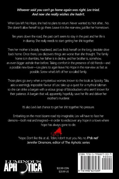 Whoever said you can't go home again was right. Lex tried. And now she really wishes she hadn't. When Lex left No Hope, she had no plans to return. Never wanted to. Not after... No. She doesn't allow herself to go there. Leave it in the rear-view, just like her hometown. Ten years down the road, the past can't seem to stay in the past and her life is in disarray. She really needs to start getting her shit together. Then her mother is brutally murdered, and Lex finds herself on the long, desolate drive back home. Once there, Lex discovers things are worse than she thought. The family home is in shambles, her father is in decline, and her brother is, somehow, an even bigger asshole than before. Taking comfort in the presence of old friends-and a possible new lover-Lex plans to again leave No Hope in the rear-view as fast as possible. Screw what's left of her so-called family. Those plans go awry when a mysterious woman, known to the locals as Spooky Talia, asks a seemingly impossible favour of Lex take up a quest for a mythical talisman so she can strike a bargain with a vicious group of bloodsuckers who aren't known for their patience. A bargain that will, apparently, hopefully, save her life and deliver her mother's murderer. It's also Lex's last chance to get her shit together. No pressure. Embarking on the most bizarre road trip imaginable, Lex will have to face her demons-both real and imagined-in order to rediscover any hope in a town where hope has always gone to die. "Nope. Don't like this at all. Tobin, I don't trust you. No, no. F*ck no!" - Jennifer Dinsmore, editor of The Aphotic series.
