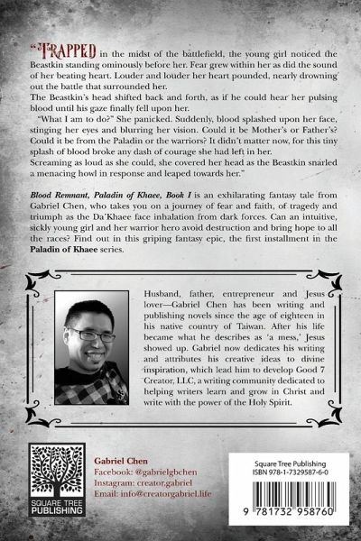 "Trapped in the midst of the battlefield, the young girl noticed the Beastkin standing ominously before her. Fear grew within her as did the sound of her beating heart. Louder and louder her heart pounded, nearly drowning out the battle that surrounded her.The Beastkin's head shifted back and forth, as if he could hear her pulsing blood until his gaze finally fell upon her."What I am to do?" She panicked. Suddenly, blood splashed upon her face, stinging her eyes and blurring her vision. Could it be Mother's or Father's? Could it be from the Paladin or the war-riors? It didn't matter now, for this tiny splash of blood broke any dash of courage she had left in her.Screaming as loud as she could, she covered her head as the Beastkin snarled a menacing howl in response and leaped towards her." Blood Remnant, Paladin of Khaee, Book I is an exhilarating fantasy tale from Gabriel Chen, who takes you on a journey of fear and faith, of tragedy and triumph as the Da'Khaee face inhalation from dark forces. Can an intuitive sickly young girl and her warrior hero avoid destruction and bring hope to all the races? Find out in this griping fantasy epic, the first installment in the Paladin of Khaee series.