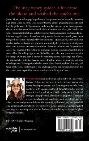Jessica Moran is walking up the pathway to her apartment when she suffers a waking nightmare. Like a fly on the wall, she is witness to a man's gruesome murder. Sucked into the grisly scene, she is overcome by the smell of shit and vomit. Looking down, she discovers her hands are thick with blood. Confused and afraid, she clutches the white rose amulet that always rests between her breasts. Normally, pristine and pure, it is now tinged crimson. It was happening again - the fits. As a youth, Jessica sees things others cannot. She is teased by her classmates - Quack, quack, queer duck. Her mother has her medicated and refuses to acknowledge her visions, so Jessica ignores them until her sister mysteriously vanishes. The stress of her sister's disappearance causes this psychic ability to take on a feverous pitch as Jessica is catapulted into a series of horrific waking nightmares. To find her sister, she must come to terms with her strange ability and learn to trust in the horrifying visions. Following a trail of clues, she discovers her sister has become involved with a ruthless high ranking member of a drug cartel. Things go from bad to worse when she is found out, drugged, and taken to the farm. The farm is not like anything anyone can envision. However, it is the perfect place to get rid of human remains-both living and dead.