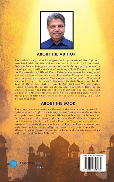 Heroine Ruby from a country named Indaana takes a flight to a country named Cheenaana as she receives an appointment letter to join as a Biological Scientist in Duhan Lab. Fortunately or unfortunately she becomes the Confidence Keeper of the Cheenaana Chief, Kin Pin. Cheenaana is friendly with the neighboring nation Paakkaana Premier Ran Kan and Indaana Prime Minister Noody is their foe. All these nations have interactions with other nations like Amariyana, Britana, Lankaana, Arabana, etc. The protagonist Kin Pin Practices Yoga and meditation and provides his spiritual power to Ruby also. They land on the moon propelled by his Supernatural powers earned by the Yoga. They mate there and an instant offspring, Lunar Baby is born-an aerospace fantasy fiction in the Stream of consciousness of an ambitious, lascivious, and laudable bold lady. This content protests against the pollution of the Divine area of the Universe.