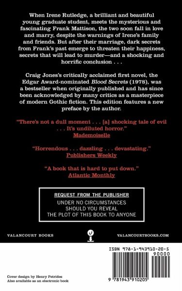 When Irene Rutledge, a brilliant and beautiful young graduate student, meets the mysterious and fascinating Frank Mattison, the two soon fall in love and marry, despite the warnings of Irene's family and friends. But after their marriage, dark secrets from Frank's past begin to emerge to threaten their happiness, secrets that will lead to murder - and a shocking and horrific conclusion ... Craig Jones's critically acclaimed first novel, the Edgar Award-nominated Blood Secrets (1978), was a bestseller when originally published and has since been acknowledged by many critics as a masterpiece of modern Gothic fiction. This edition features a new preface by the author. "There's not a dull moment ... [a] shocking tale of evil ... It's undiluted horror." - Mademoiselle "Horrendous ... dazzling ... devastating." - Publishers Weekly "A book that is hard to put down." - Atlantic Monthly