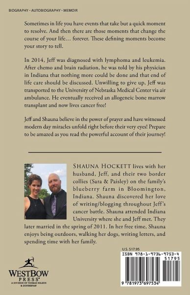Sometimes in life you have events that take but a quick moment to resolve. And then there are those moments that change the course of your life... forever. These defining moments become your story to tell. In 2014, Jeff was diagnosed with lymphoma and leukemia. After chemo and brain radiation, he was told by his physician in Indiana that nothing more could be done and that end of life care should be discussed. Unwilling to give up, Jeff was transported to the University of Nebraska Medical Center via air ambulance. He eventually received an allogeneic bone marrow transplant and now lives cancer free! Jeff and Shauna believe in the power of prayer and have witnessed modern day miracles unfold right before their very eyes! Prepare to be amazed as you read the powerful account of their journey!
