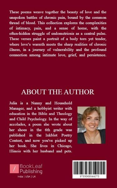 These poems weave together the beauty of love and the unspoken battles of chronic pain, bound by the common thread of blood. This collection explores the complexities of intimacy, pain, and a sense of home, with the often-hidden struggle of endometriosis as a central pulse. These verses paint a portrait of a body torn yet tender, where love's warmth meets the sharp realities of chronic illness, in a journey of vulnerability and the profound connection among intimate love, grief, and persistence.