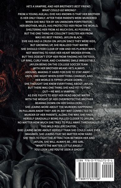 He's a vampire, and her brother's best friend. What could go wrong? From a young age, all Evie has known is that her brother is her only family. After their parents were murdered at a young age by an unknown perpetrator, her brother, Miles, has protected her from the world, sheltering her from as much evil as possible. But the one thing he couldn't shelter her from was his best friend, Jaylen Black. Evie has had a crush on Jaylen since they were kids, but growing up, she realized that maybe she should steer clear of him and his playboy ways, not wanting to have her heart broken by him. But this doesn't stop her from finding him attractive, and irresistible. Jaylen being on the college soccer team with her brother means he's always around, making it hard for Evie to stay away-until one night when everything changes and Evie's world is tipped upside down. She thought she knew everything about Jaylen, but there was one thing she had yet to find out-he was a vampire. As Evie fights to keep her head above water with the weight of her overprotective brother bearing down on her shoulders, she learns more about the murders happening in Pullman and if they are in any way connected to the murder of her parents. Along the way, she finds herself gradually being pulled closer to Jaylen, no matter how much she tries to pull away. Throughout this wild rollercoaster, Evie learns more about herself than she could have ever imagined. She learns that no matter how hard she tries to fight the attraction between her and Jaylen, she will always be...his girl. "What's the matter, little angel? You look like you've seen a ghost."
