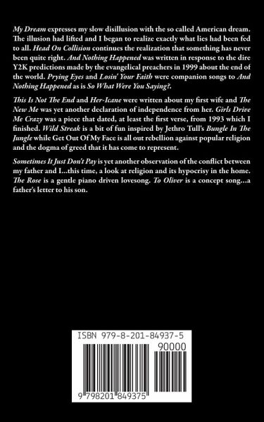 My Dream expresses my slow disillusion with the so called American dream. The illusion had lifted and I began to realize exactly what lies had been fed to all. Head On Collision continues the realization that something has never been quite right. And Nothing Happened was written in response to the dire Y2K predictions made by the evangelical preachers in 1999 about the end of the world. Prying Eyes and Losin' Your Faith were companion songs to And Nothing Happened as is So What Were You Saying?. This Is Not The End and Her-Icane were written about my first wife and The New Me was yet another declaration of independence from her. Girls Drive Me Crazy was a piece that dated, at least the first verse, from 1993 which I finished. Wild Streak is a bit of fun inspired by Jethro Tull's Bungle In The Jungle while Get Out Of My Face is all out rebellion against popular religion and the dogma of greed that it has come to represent. Sometimes It Just Don't Pay is yet another observation of the conflict between my father and I...this time, a look at religion and its hypocrisy in the home. The Rose is a gentle piano driven lovesong. To Oliver is a concept song…a father's letter to his son.