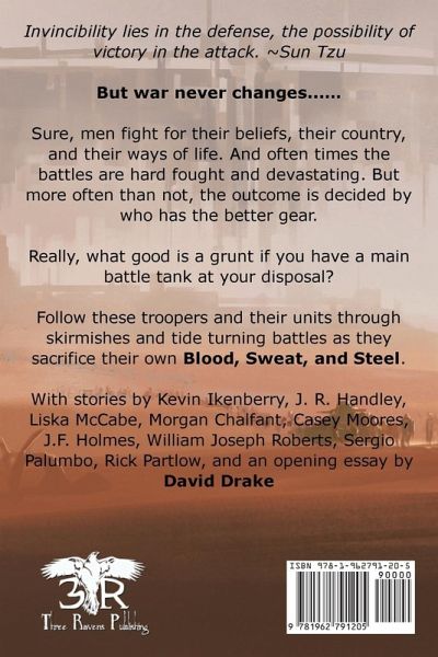 Invincibility lies in the defense, the possibility of victory in the attack. ~Sun Tzu But war never changes... Sure, men fight for their beliefs, their country, and their ways of life. And often times the battles are hard fought and devastating. But more often than not, the outcome is decided by who has the better gear. Really, what good is a grunt if you have a main battle tank at your disposal? Follow these troopers and their units through skirmishes and tide-turning battles as they sacrifice their own Blood, Sweat, and Steel. With stories by Kevin Ikenberry, J. R. Handley, Liska McCabe, Morgan Chalfant, Casey Moores, J.F. Holmes, William Joseph Roberts, Sergio Palumbo, Rick Partlow, and an opening essay by David Drake