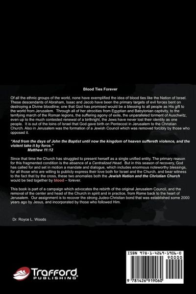 Blood Ties Forever explores the church's need for reconciliation with the Jewish nation and encourages a rebirth of meaningful respect worldwide for different ethnic groups. Dr. Royce Woods, senior pastor of Holy Trinity Worship Center International in Washington, D.C., introduces the truth and offers purpose and direction as he promotes the resurrection of the original Jerusalem Council, once removed forcibly by those who opposed it. Woods begins by detailing his own spiritual journey as the seventeenth of eighteen children who grew up on the streets of Washington, D.C. and transitions into a discussion about why, out of all the ethnic groups of the world, none have exemplified the idea of blood ties like the Nation of Israel-descendants of Abraham, Isaac and Jacob and the primary targets of dark forces bent on destroying their bloodline. Woods includes applicable scripture as he encourages the removal of the center and head of the church in spirit and in practice from Rome back to the heart of Jerusalem. Blood Ties Forever transports others on an amazing journey into the mind of God, ultimately illustrating that God's promises will indeed be a blessing to all people as His gift to the world.