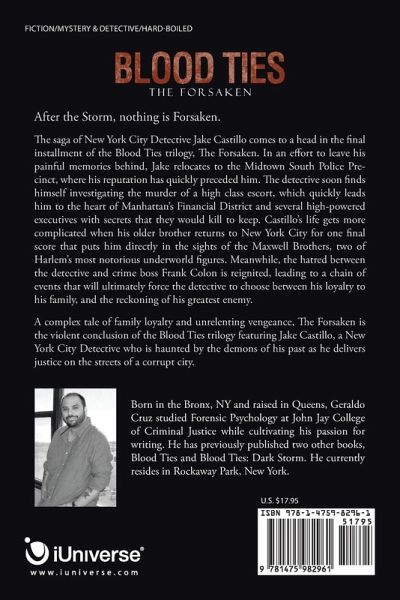 Aftre the Storm, nothing is Forsaken. The sage of New York City Detective Jake Castillo comes to a head in the final installment of the Blood Ties trilogy, The Forsaken. In an effort to leave his painful memories behind, Jake relocates to the Midtown South Police Precinct, where his reputation has quickly preceded him. The detective soon finds himself investigating the murder of a high class escort, which quickly leads him to the heart of Manhattan's Financial District and several high-powered executives with secrets that they would kill to keep. Castillo's life gets more complicated when his older brother returns to New York City for one final score that puts him directly in the sights of the Maxwell Brothers, two of Harlem's most notorious underworld figures. Meanwhile, the hatred between the detective and crime boss Frank Colon is reignited, leading to a chain of events that will ultimately force the detective to choose between his loyalty to his family, and the reckoning of his greatest enemy. A complex tale of family loyalty and unrelenting vengeance, The Forsaken is the violent conclusion of the Blood Ties trilogy featuring Jake Castillo, a New York City Detective who is haunted by the demons of his past as he delivers justice on the streets if a corrupt city.