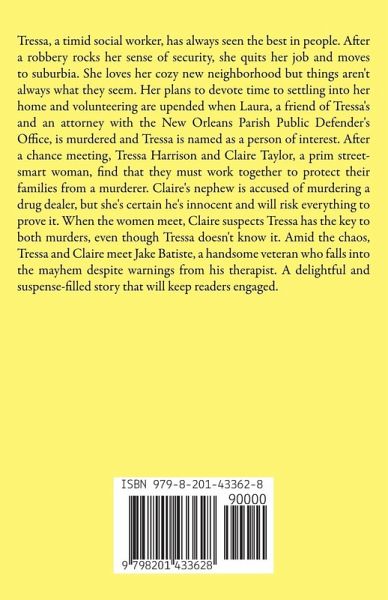 Tressa, a timid social worker, has always seen the best in people. After a robbery rocks her sense of security, she quits her job and moves to suburbia. She loves her cozy new neighborhood, but things aren't always what they seem. Her plans to devote time to settling into her home and volunteering are upended when Laura, a friend of Tressa's and an attorney with the New Orleans Parish Public Defender's Office, is murdered and Tressa is named as a person of interest. After a chance meeting, Tressa Harrison and Claire Taylor, a prim street-smart woman, find that they must work together to protect their families from a murderer. Claire's nephew is accused of murdering a drug dealer, but she's certain he's innocent and will risk everything to prove it. When the women meet, Claire suspects Tressa has the key to both murders, even though Tressa doesn't know it. Amid the chaos, Tressa and Claire meet Jake Batiste, a handsome veteran who falls into the mayhem despite warnings from his therapist. A delightful and suspense-filled story that will keep readers engaged.