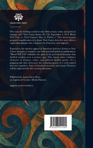 Dive into the thrilling world of early 20th-century crime and political intrigue with "Nick Carter Stories No 156, September 4, 1915: Blood Will Tell, or Nick Carter's Play in Politics." This meticulously prepared republication of a classic Nick Carter detective story offers a captivating glimpse into a bygone era of mystery and suspense. Experience the timeless appeal of American detective fiction as Nick Carter navigates a complex case with potential political ramifications. "Blood Will Tell" embodies the spirit of the periodical literature that thrilled readers over a century ago. This classic story combines elements of mystery, crime, and political thriller genres. It's a gripping tale that showcases the enduring power of a well-crafted detective narrative. Fans of historical mysteries and classic Westerns will be captivated by this exciting adventure. This work has been selected by scholars as being culturally important, and is part of the knowledge base of civilization as we know it. This work is in the public domain in the United States of America, and possibly other nations. Within the United States, you may freely copy and distribute this work, as no entity (individual or corporate) has a copyright on the body of the work. Scholars believe, and we concur, that this work is important enough to be preserved, reproduced, and made generally available to the public. We appreciate your support of the preservation process, and thank you for being an important part of keeping this knowledge alive and relevant.