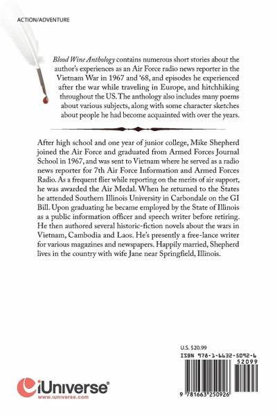 Blood Wine Anthology contains numerous short stories about the author's experiences as an Air Force radio news reporter in the Vietnam War in 1967 and '68, and episodes he experienced after the war while traveling in Europe, and hitchhiking throughout the US. The anthology also includes many poems about various subjects, along with some character sketches about people he had become acquainted with over the years.