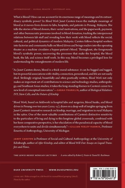 What is blood? How can we account for its enormous range of meanings and its extraordinary symbolic power? In Blood Work Janet Carsten traces the multiple meanings of blood as it moves from donors to labs, hospitals, and patients in Penang, Malaysia. She tells the stories of blood donors, their varied motivations, and the paperwork, payment, and other bureaucratic processes involved in blood donation, tracking the interpersonal relations between lab staff and revealing how their work with blood reflects the social, cultural, and political dynamics of modern Malaysia. Carsten follows hospital workers into factories and community halls on blood drives and brings readers into the operating theater as a machine circulates a bypass patient's blood. Throughout, she foregrounds blood's symbolic power, uncovering the processes that make the hospital, the blood bank, the lab, and science itself work. In this way, blood becomes a privileged lens for understanding the entanglements of modern life.