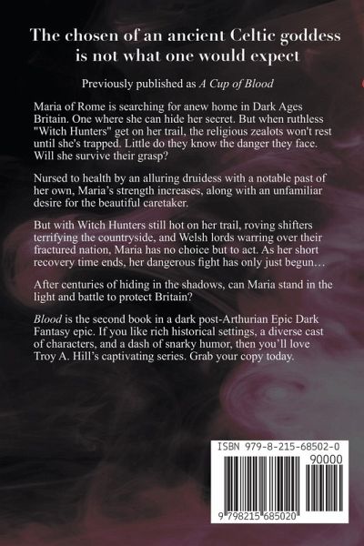 Previously published as "A Cup of Blood" Arthur is dead, but a new evil is stirring. The chosen of an ancient Celtic goddess is not what one would expect. Maria of Rome is searching for anew home in Dark Ages Britain. One where she can hide her secret. But when ruthless "Witch Hunters" get on her trail, the religious zealots won't rest until she's trapped. Little do they know the danger they face. Will she survive their grasp? Nursed to health by an alluring druidess with a notable past of her own, Maria's strength increases, along with an unfamiliar desire for the beautiful caretaker. But with Witch Hunters still hot on her trail, roving shifters terrifying the countryside, and Welsh lords warring over their fractured nation, Maria has no choice but to act. As her short recovery time ends, her dangerous fight has only just begun... After centuries of hiding in the shadows, can Maria stand in the light and battle to protect Britain? Blood is the second book in a dark post-Arthurian Epic Dark Fantasy epic. If you like rich historical settings, a diverse cast of characters, and a dash of snarky humor, then you'll love Troy A. Hill's captivating series. Grab your copy today. Note: The author has combined the Cup of Blood and the Penllyn Chronicles series into one series. The books have been new covers, but the story is still the same. Books in the series are: Preludes Blood Soul Blink Whisper Shadows Chaos Sovereign * Coming 2024