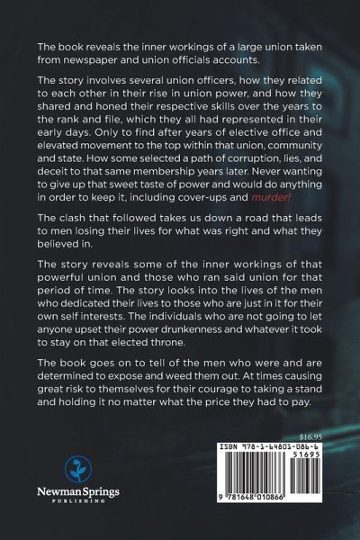 The book reveals the inner workings of a large union taken from newspaper and union officials accounts. The story involves several union officers, how they related to each other in their rise in union power, and how they shared and honed their respective skills over the years to the rank and file, which they all had represented in their early days. Only to find after years of elective office and elevated movement to the top within that union, community and state. How some selected a path of corruption, lies, and deceit to that same membership years later. Never wanting to give up that sweet taste of power and would do anything in order to keep it, including cover-ups and murder! The clash that followed takes us down a road that leads to men losing their lives for what was right and what they believed in. The story reveals some of the inner workings of that powerful union and those who ran said union for that period of time. The story looks into the lives of the men who dedicated their lives to those who are just in it for their own self interests. The individuals who are not going to let anyone upset their power drunkenness and whatever it took to stay on that elected throne. The book goes on to tell of the men who were and are determined to expose and weed them out. At times causing great risk to themselves for their courage to taking a stand and holding it no matter what the price they had to pay.