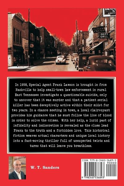 In 1958, Special Agent Frank Lawson is brought in from Nashville to help small-town law enforcement in rural East Tennessee investigate a questionable suicide, only to uncover that it was murder and that a patient serial killer has been deceptively active within their midst for two years. In a chance meeting in town, a local clairvoyant provides Frank guidance that he must follow the line of blood in order to solve the crimes. With her help, a lurid past of infidelity and indiscretion is revealed as the clues lead Frank to the truth and a forbidden love. This historical fiction weaves actual characters and unique local history into a fast-moving thriller full of unexpected twists and turns that will leave you breathless.