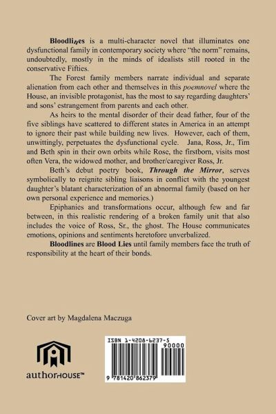 Bloodli(n)es is a multi-character novel that illuminates one dysfunctional family in contemporary society where "the norm" remains, undoubtedly, mostly in the minds of idealists still rooted in the conservative Fifties. The Forest family members narrate individual and separate alienation from each other and themselves in this poemnovel where the House, an invisible protagonist, has the most to say regarding daughters' and sons' estrangement from parents and each other. As heirs to the mental disorder of their dead father, four of the five siblings have scattered to different states in America in an attempt to ignore their past while building new lives. However, each of them, unwittingly, perpetuates the dysfunctional cycle. Jana, Ross, Jr., Tim and Beth spin in their own orbits while Rose, the firstborn, visits most often Vera, the widowed mother, and brother/caregiver Ross, Jr.. Beth's debut poetry book, Through the Mirror, serves symbolically to reignite sibling liaisons in conflict with the youngest daughter's blatant characterization of an abnormal family (based on her own personal experience and memories.) Epiphanies and transformations occur, although few and far between, in this realistic rendering of a broken family unit that also includes the voice of Ross, Sr., the ghost, and the House communicate emotions, opinions and sentiments heretofore unverbalized. Bloodlines are Blood Lies until family members face the truth of responsibility at the heart of their bonds.