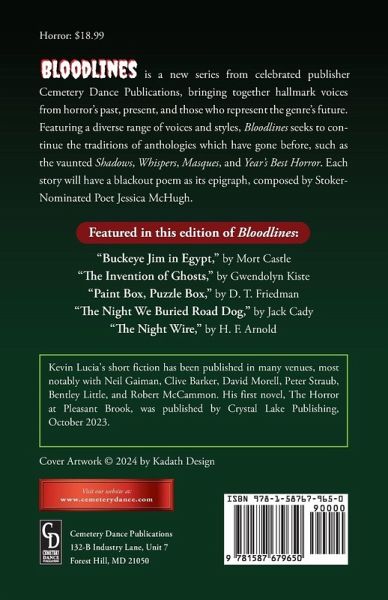 Bloodlines is a new series from celebrated publisher Cemetery Dance Publications, bringing together hallmark voices from horror's past, present, and those who represent the genre's future. Featuring a diverse range of voices and styles, Bloodlines seeks to continue the traditions of anthologies which have gone before, such as the vaunted Shadows, Whispers, Masques, and Year's Bester Horror. Each story will have a blackout poem as its epigraph, composed by Stoker-Nominated Poet Jessica McHugh. Featured in this edition of Bloodlines: "Buckeye Jim in Egypt," by Mort Castle "The Invention of Ghosts," by Gwendolyn Kiste "Paint Box, Puzzle Box," by D. T. Friedman "The Night We Buried Road Dog," by Jack Cady "The Night Wire," by H. F. Arnold