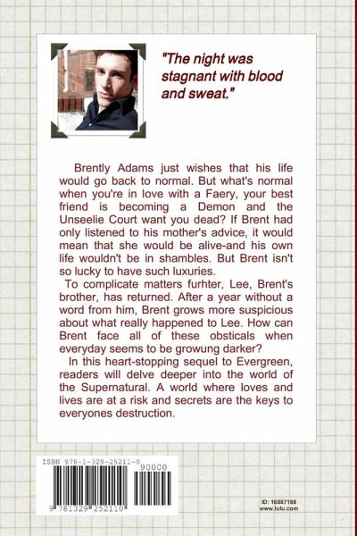 Brently Adams just wishes that his life would go back to normal. But what's normal when you're in love with a Faery, your best friend is becoming a Demon, and the Unseelie Court wants you dead? If Brent had only listened to his mother's advice, it would mean that she would be alive-and his own life wouldn't be in shambles. But Brent isn't so lucky to have such luxuries. To complicate matters further, Lee, Brent's brother, has returned. After a year without a word from him, Brent grows more suspicious about what really happened to Lee. How can Brent face all of these obstacles, when everyday seems to be growing darker. In this heart-stopping sequel to Evergreen, readers will delve deeper in the Supernatural world. A world where loves and lives are at risk and secrets are the keys to everyones destruction.