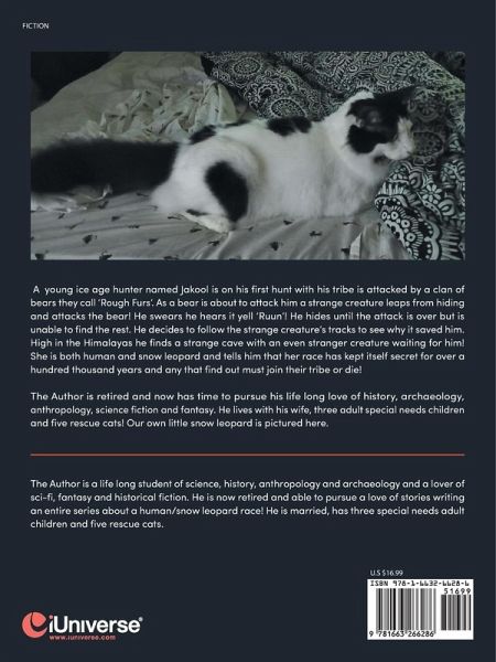 A young ice age hunter named Jakool is on his first hunt with his tribe is attacked by a clan of bears they call 'Rough Furs'. As a bear is about to attack him a strange creature leaps from hiding and attacks the bear! He swears he hears it yell 'Ruun'! He hides until the attack is over but is unable to find the rest. He decides to follow the strange creature's tracks to see why it saved him. High in the Himalayas he finds a strange cave with an even stranger creature waiting for him! She is both human and snow leopard and tells him that her race has kept itself secret for over a hundred thousand years and any that find out must join their tribe or die! The Author is retired and now has time to pursue his life long love of history, archaeology, anthropology, science fiction and fantasy. He lives with his wife, three adult special needs children and five rescue cats! Our own little snow leopard is pictured here.