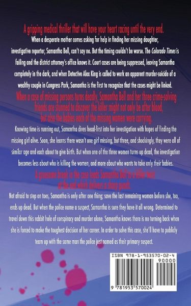 A gripping medical mystery thriller that will have your heart racing until the very end. When a desperate mother comes asking for help in finding her missing daughter, investigative reporter, Samantha Bell, can't say no. But the timing couldn't be worse. The Colorado Times is failing and the district attorney's office knows it. Court cases are being suppressed, leaving Samantha completely in the dark, and when Detective Alex King is called to work an apparent murder-suicide of a wealthy couple in Congress Park, Samantha is the first to recognize that the cases might be linked. When a case of missing persons turns deadly, Samantha Bell and her three crime-solving friends are stunned to discover the killer might not only be after blood, but also the babies each of the missing women were carrying. Knowing time is running out, Samantha dives head-first into her investigation with hopes of finding the missing girl alive. Soon, she learns there wasn't one girl missing, but three, and shockingly, they were all of similar age and each about to give birth. But when one of the three women turns up dead, the investigation becomes less about who is killing the women, and more about who wants to take only their babies. A gruesome break in the case leads Samantha Bell to a killer twist at the end which delivers a sharp punch. Not afraid to step on toes, Samantha is only after one thing; save the last remaining woman before she, too, ends up dead. But when the police name a suspect, Samantha is sure they have it all wrong. Determined to travel down this rabbit hole of conspiracy and murder alone, Samantha knows there is no turning back when she is forced to make the toughest decision of her career. In order to solve this case, she'll have to publicly team up with the same man the police just named as their primary suspect.