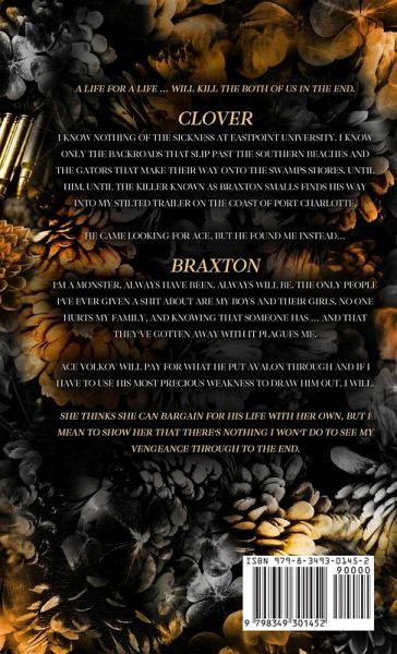 A life for a life ... will kill the both of us in the end. Clover I know nothing of the Sickness at Eastpoint University. I know only the backroads that slip past the southern beaches and the gators that make their way onto the swamps shores. Until him. Until the killer known as Braxton Smalls finds his way into my stilted trailer on the coast of Port Charlotte. He came looking for Ace, but he found me instead... Braxton I'm a monster. Always have been. Always will be. The only people I've ever cared about are my boys and their girls. No one hurts my family, and knowing that someone has ... and that they've gotten away with it plagues me. Ace Volkov will pay for what he put Avalon through and if I have to use his most precious weakness to draw him out, I will. She thinks she can bargain for his life with her own, but I mean to show her that there's nothing I won't do to see my vengeance through to the end. ***This is a Dark MF Enemies to Lovers College Romance.*** ***Please Note: This book is labeled as "Dark" for a reason. If you are sensitive or easily triggered by subjects and actions that are common in "dark" romance, please take that into consideration and read responsibly.***