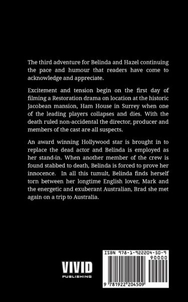The third adventure for Belinda and Hazel continuing the pace and humour that readers have come to acknowledge and appreciate. Excitement and tension begin on the first day of filming a Restoration drama on location at the historic Jacobean mansion, Ham House in Surrey when one of the leading players collapses and dies. With the death ruled non-accidental the director, producer and members of the cast are all suspects. An award winning Hollywood star is brought in to replace the dead actor and Belinda is employed as her stand-in. When another member of the crew is found stabbed to death, Belinda is forced to prove her innocence. In all this tumult, Belinda finds herself torn between her longtime English lover, Mark and the energetic and exuberant Australian, Brad she met again on a trip to Australia.