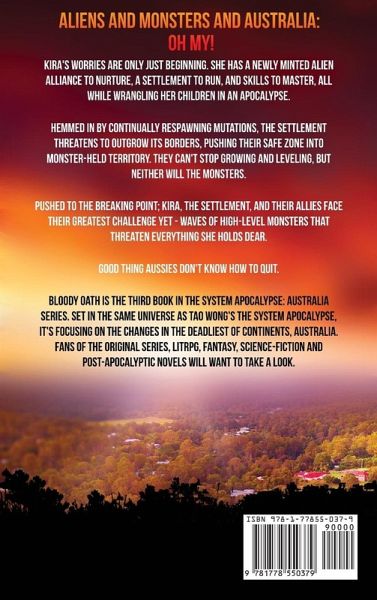 Aliens and monsters and Australia: Oh My! Kira's worries are only just beginning. She has a newly minted alien alliance to nurture, a settlement to run, and Skills to master, all while wrangling her children in an apocalypse. Hemmed in by continually respawning mutations, the settlement threatens to outgrow its borders, pushing their safe zone into monster-held territory. They can't stop growing and Leveling, but neither will the monsters. Pushed to the breaking point; Kira, the settlement, and their allies face their greatest challenge yet - waves of high-level monsters that threaten everything she holds dear. Good thing Aussies don't know how to quit. Bloody Oath is the third book in The System Apocalypse: Australia series. Set in the same universe as Tao Wong's the System Apocalypse, it's focusing on the changes in the deadliest of continents, Australia. Fans of the original series, LitRPG, fantasy, science-fiction and post-apocalyptic novels will want to take a look.