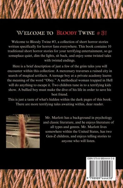 Welcome to Bloody Twine #3, a collection of short horror stories written specifically for horror fans everywhere. This book contains 10 traditional short horror stories for your terrifying entertainment, so go someplace quiet, dim the lights, sit back, and enjoy some twisted tales with twisted endings. Here is a brief description of just a few of the grim tales you will encounter within this collection: A mercenary traverses a ruined city in search of magical artifacts. A teenage boy at a private academy learns the meaning of the word "Obey." A methodical woman trapped in Hell will do anything to escape it. Two children tune in to a terrifying kids show. A bullied boy must make the dive of his life in order to save his best friend. This is just a taste of what's hidden within the dark pages of this book. There are more terrifying tales awaiting within, dear reader. Imagine walking into an abandoned storage room filled with old newspapers and magazines, all articles stacked in bundles neatly tied with twine, but then you discover other bundles, bundles not so neatly tied, ragged bundles of yellowed and partially-charred paper tied in bloodstained twine. You see, some stories are meant to educate, and some stories are meant to entertain, but some stories...some stories are simply looking for a victim. Enjoy.