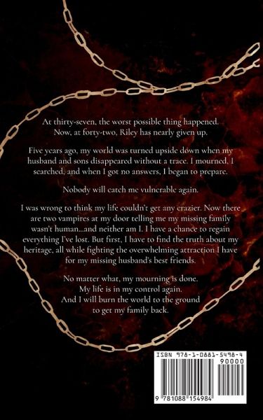 At thirty-seven, the worst possible thing happened. Now, at forty-two, Riley has nearly given up. Five years ago, my world was turned upside down when my husband and sons disappeared without a trace. I mourned, I searched, and when I got no answers, I began to prepare. Nobody will catch me vulnerable again. I was wrong to think my life couldn't get any crazier. Now there are two vampires at my door telling me my missing family wasn't human...and neither am I. I have a chance to regain everything I've lost. But first, I have to find the truth about my heritage, all while fighting the overwhelming attraction I have for my missing husband's best friends. No matter what, my mourning is done. My life is in my control again. And I will burn the world to the ground to get my family back.