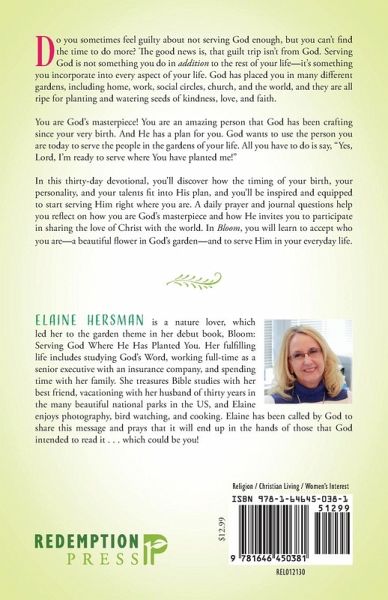 Do you sometimes feel guilty about not serving God enough, but you can't find the time to do more? The good news is, that guilt trip isn't from God. Serving God is not something you do in addition to the rest of your life-it's something you incorporate into every aspect of your life. God has placed you in many different gardens, including home, work, social circles, church, and the world, and they are all ripe for planting and watering seeds of kindness, love, and faith. You are God's masterpiece! You are an amazing person that God has been crafting since your very birth. And He has a plan for you. God wants to use the person you are today to serve the people in the gardens of your life. All you have to do is say, "Yes, Lord, I'm ready to serve where You have planted me!" In this thirty-day devotional, you'll discover how the timing of your birth, your personality, and your talents fit into His plan, and you'll be inspired and equipped to start serving Him right where you are. A daily prayer and journal questions help you reflect on how you are God's masterpiece and how He invites you to participate in sharing the love of Christ with the world. In Bloom, you will learn to accept who you are-a beautiful flower in God's garden-and to serve Him in your everyday life.