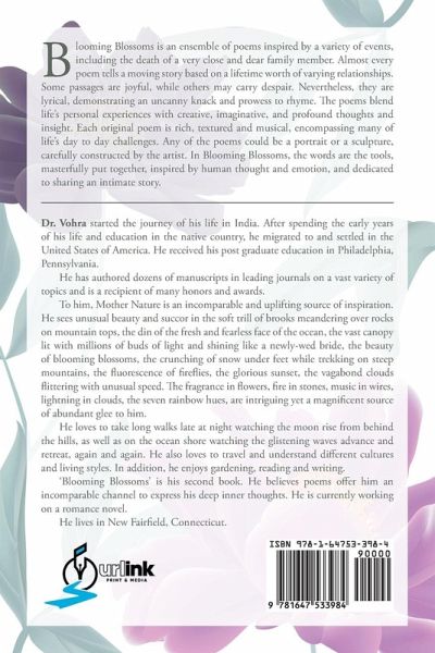 Blooming Blossoms is an ensemble of poems inspired by a variety of events, including the death of a very close and dear family member. Almost every poem tells a moving story based on a lifetime worth of varying relationships. Some passages are joyful, while others may carry despair. Nevertheless, they are lyrical, demonstrating an uncanny knack and prowess to rhyme. The poems blend life's personal experiences with creative, imaginative, and profound thoughts and insight. Each original poem is rich, textured and musical, encompassing many of life's day to day challenges. Any of the poems could be a portrait or a sculpture, carefully constructed by the artist. In Blooming Blossoms, the words are the tools, masterfully put together, inspired by human thought and emotion, and dedicated to sharing an intimate story. Dr. Vohra started the journey of his life in India. After spending the early years of his life and education in the native country, he migrated to and settled in the United States of America. He received his post graduate education in Philadelphia, Pennsylvania. He has authored dozens of manuscripts in leading journals on a vast variety of topics and is a recipient of many honors and awards. To him, Mother Nature is an incomparable and uplifting source of inspiration. He sees unusual beauty and succor in the soft trill of brooks meandering over rocks on mountain tops, the din of the fresh and fearless face of the ocean, the vast canopy lit with millions of buds of light and shining like a newly-wed bride, the beauty of blooming blossoms, the crunching of snow under feet while trekking on steep mountains, the fluorescence of fireflies, the glorious sunset, the vagabond clouds flittering with unusual speed. The fragrance in flowers, fire in stones, music in wires, lightning in clouds, the seven rainbow hues, are intriguing yet a magnificent source of abundant glee to him. He loves to take long walks late at night watching the moon rise from behind the hills, as well as on the ocean shore watching the glistening waves advance and retreat, again and again. He also loves to travel and understand different cultures and living styles. In addition, he enjoys gardening, reading and writing. 'Blooming Blossoms' is his second book. He believes poems off er him an incomparable channel to express his deep inner thoughts. He is currently working on a romance novel. He lives in New Fairfield, Connecticut.